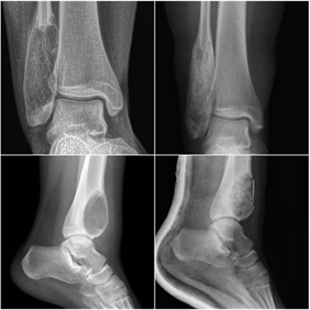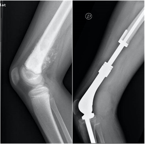 Los sarcomas óseos son tumores óseos muy infrecuentes, con una incidencia aproximada de 1 caso por cada 100.0000 habitantes. El Osteosarcoma es el tumor óseo primario maligno más frecuente en la infancia, seguido por el el Sarcoma de Ewing. En las radiografías se suelen evidenciar lesiones líticas, permeativas, con destrucción ósea, reacción perióstica y afectación del los tejidos blandos cercanos. Estos pacientes ,además de dos proyecciones radiográficas, precisarán estudios complementarios de imagen, biopsia, estudio de extensión para descartar diseminación pulmonar, y valoración multidisciplinar. La cirugía oncológica de salvamento de extremidad y reconstrucción es la técnica de elección.