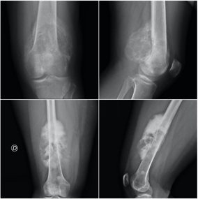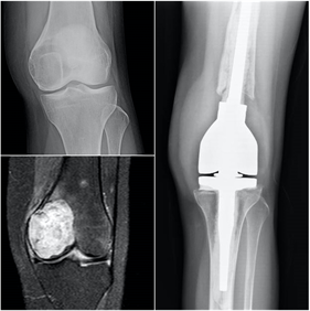 El tumor de células gigantes es una lesión tumoral benigna pero localmente agresiva. Provoca lesiones líticas expansivas que se localizan fundamentalmente en las metáfisis y epífisis de huesos largos. La edad de aparición está entre los 20 y 50 años y se suele localizar con mayor frecuencia en la zona cercana a la rodilla, en la epífisis distal del fémur, en la tibia proximal y en el radio distal. Se describe la presencia de metástasis pulmonares en casi el 5% de los pacientes. Habitualmente el paciente refiere una historia de dolor persistente en torno a la rodilla, con afectación progresiva de la funcionalidad. Las fracturas patológicas suelen aparecer fundamentalmente en casos avanzados, con gran debilidad cortical. En la rodilla puede asociar derrame articular y fracturas osteocondrales por debilidad del hueso subcondral.